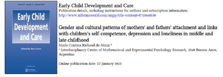 Richaud de Minzi, María Cristina. 2010. “Gender and cultural patterns of mothers’ and fathers’ attachment and links with children’s self-competence, depression and loneliness in middle and late childhood.” Early Child Development and Care 180:1-2, 193-209. DOI:10.1080/03004430903415056.
