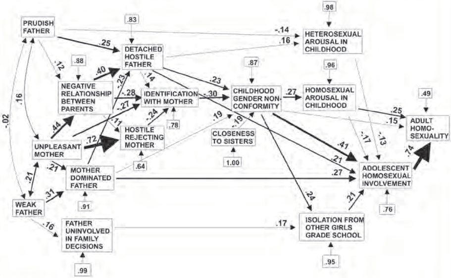 有論者引1981年一項路徑分析,指同性戀非因社會或家庭影響;但此「路徑」似乎不大可靠,結論也完全不堅實。Bell、Weinberg與Hammersmith(1981a,1981b)認為,大多數成年同性戀皆源於懷胎期就形成的「故態」,此為謬誤之說。