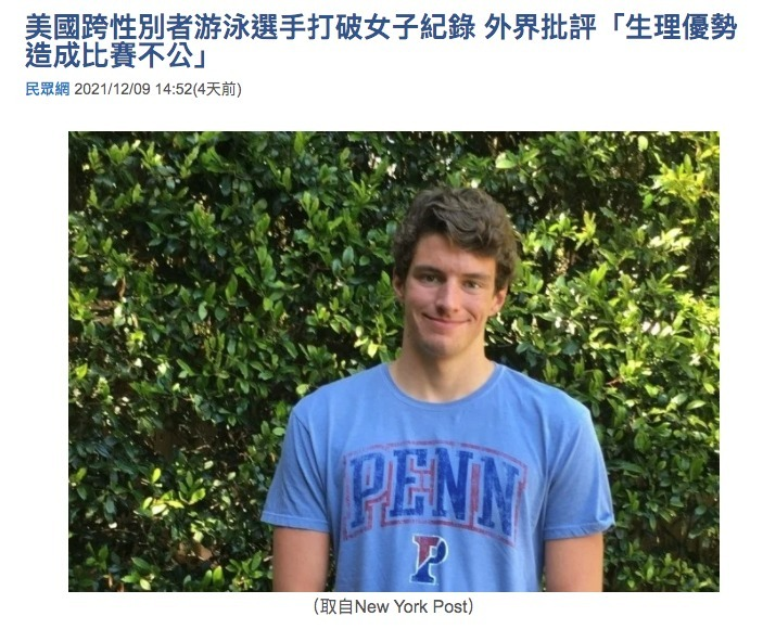 【民眾網編輯喬偉綱/綜合報導】美國一名跨性別游泳選手莉亞托馬斯(Lia Thomas)以4分34秒贏得女子常春藤聯盟500公尺自由式(Women’s Ivy League record for the 500 freestyle)冠軍,還打破2020年愛莉馬夸特(Ellie Marquardt)的4分36秒,贏得最佳紀錄,但因為身為跨性別者,卻遭到外界批評比賽不公,外界甚至有批評他行為「相當自私」的聲音。