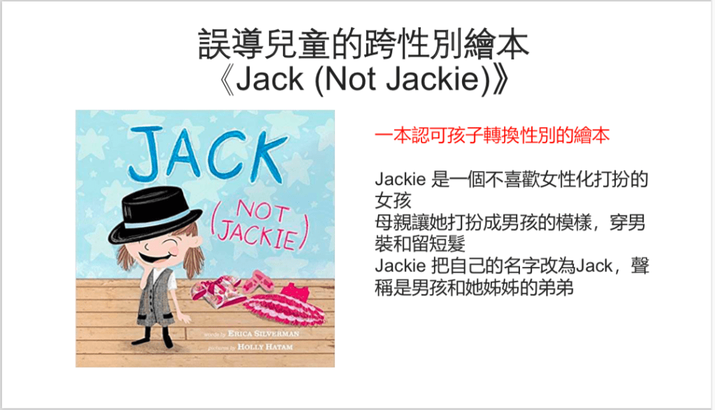 誤導兒童的跨性別繪本《Jack (Not Jackie)》 17 四月, 20239 六月, 2023 / 香港性文化學會 誤導兒童的跨性別繪本《Jack (Not Jackie)》 一本認可孩子轉換性別的繪本 Jackie 是一個不喜歡女性化打扮的女孩 母親讓她打扮成男孩的模樣,穿男裝和留短髮 Jackie 把自己的名字改為Jack,聲 稱是男孩和她姊姊的弟弟 分享此文: 按一下即可分享至 X(在新視窗中開啟) X 按一下以分享至 Facebook(在新視窗中開啟) Facebook 喜歡 正在載入... 相關